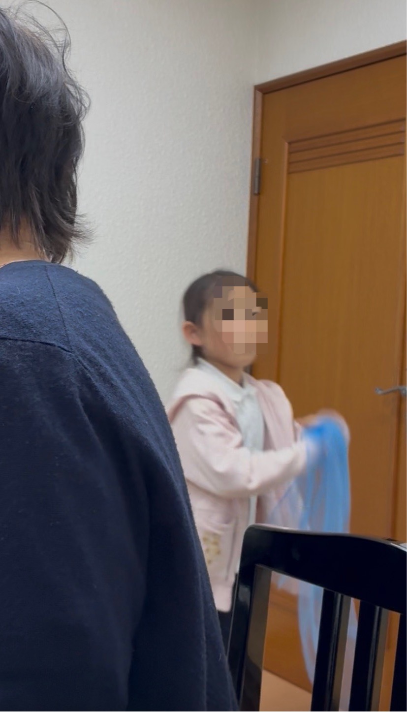 音符の長さをかき分けて、表現。4分音符は歩く。2分音符はスカーフ振って。全音符はどんな動きにする?ちょっと見にくいけれど、音符を聞き分けてスカーフを振るYちゃん。